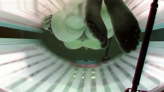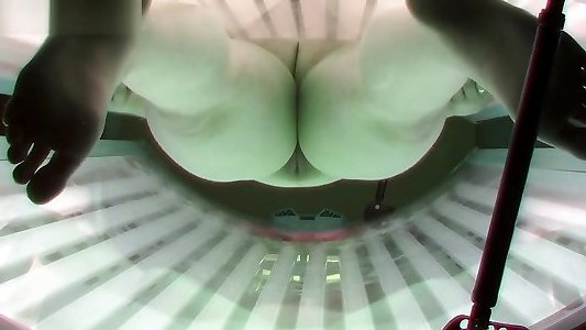 une femme obèse à la poitrine énorme qui se calme dans un lit de bronzage au solarium