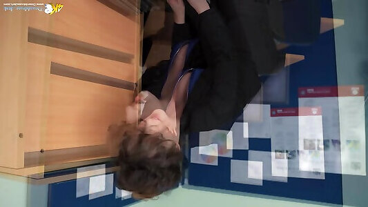 magnifique funbag aux cheveux roux wonder britney gomme à baiser et à inhaler sur la salle de repos. un décolleté profond, des sacs damusement innés, des chaussons hauts à talons hauts et des bas en nylon de couleur foncée. cum sur une large cruches accomplir!