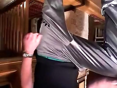 adolescent footjob, legjob dans un pantalon stretch brillant aux teintes foncées