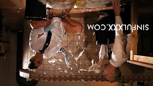 eden sin, une petite brune aux cheveux noirs, est nourrie de jus de fruit après une orgie folle dans la cuisine
