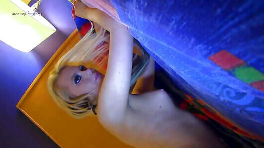 la belle femme blond maigre taquine et se déshabille pendant cam flash