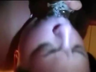 pipe bâclée dans un masque-beaucoup de sperme sur le visage