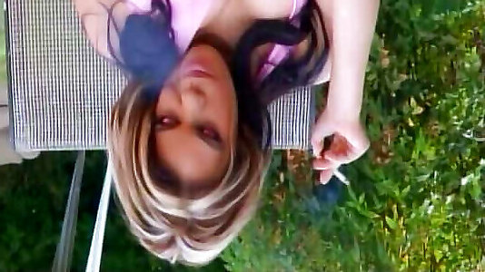 une salope aux gros seins qui fume des cigarettes aime une bite dure en train de la baiser en levrette à lextérieur