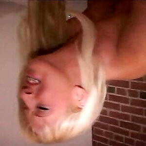 une nana blonde aux petits seins en talons hauts se fait prendre en gorge profonde et en levrette
