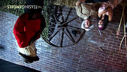 trio de filles coquines baisant avec deux cow-boys dans la grange