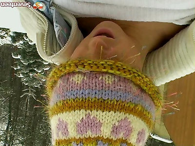 la folle blonde aux frênes se masturbe sa chatte avec un gant dans la paume de la main par temps de neige