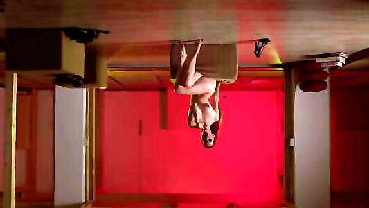 le mannequin aux cheveux rouges joue avec sa chatte lisse écartant les jambes grandes ouvertes