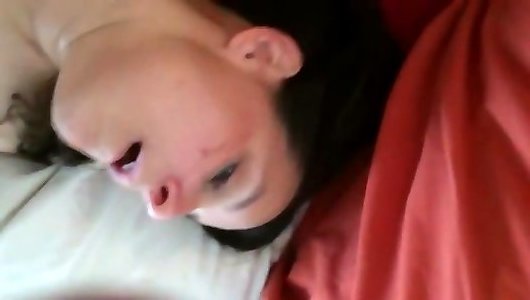 éclaboussure de cooch aux teintes foncées dans la gorge, seins flasques, jambes sur la tête