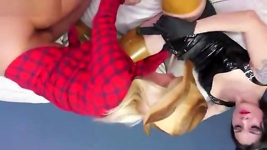 2 garçons profitent dune brunette et lui font du jus