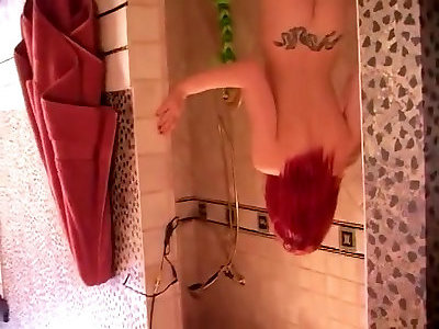bimbo tatouée aux cheveux roux en bas jouant sa chatte percée dans la douche