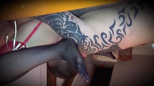 une bombe tatouée qui joue avec un faux pénis en verre