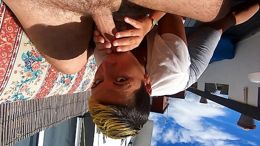 petite amie asiatique ludique reçoit une grosse éjaculation sur la terrasse