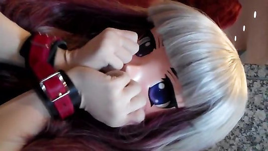 une poupée aux cheveux cramoisis nus a attaché les bras du fille et s&039;est branlée sur sa bite