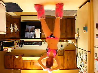 babe plantureuse cuisinant des aliments en string rouge et haut rose. bandes lentement
