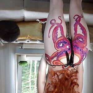culotte sexy essayée par une adolescente rousse aux seins nus avec un tatouage de kraken sur un gros cul