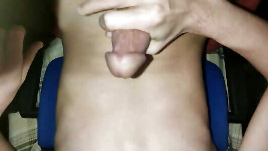 un homme amateur branle durement son énorme bite non coupée dans des gants en latex bleu avec une éjaculation de sperme strike