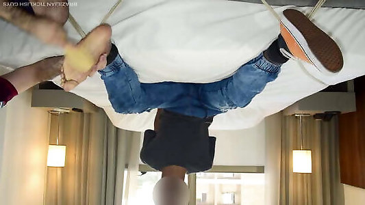 un minet attaché reçoit un coup de main de sir qui aime tout