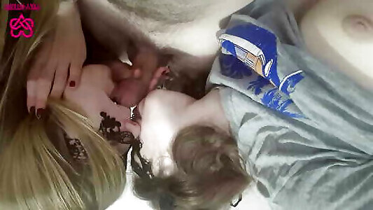 deux filles partagent une virilité décente et commencent à sembrasser après quil ait éjaculé dans la bouche dune fille