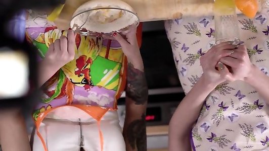2 lezzies en fusion mangeant de la mousse sur le canapé part1