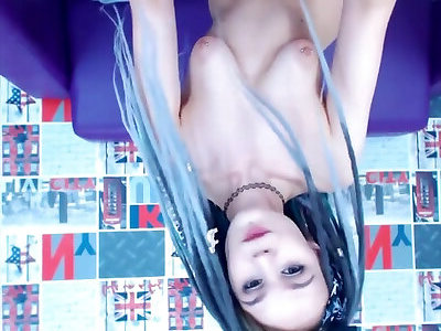 belle femme licorne aux cheveux violets et au corps doté se masturbe désespérément avec un faux pénis