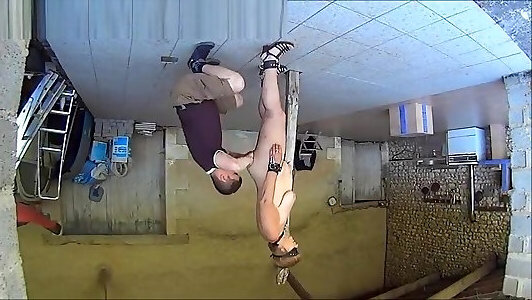 un serviteur nu est attaché et se fait déchirer le cul avec un jouet utilisé par la méga-salope