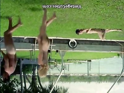 spectacle de poon en plein air. un duo nu joue dans la piscine naturiste extérieure. regina noir culotte 2