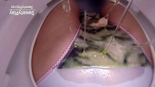 manchon humide urinant à travers une culotte tout en étant assis sur les toilettes