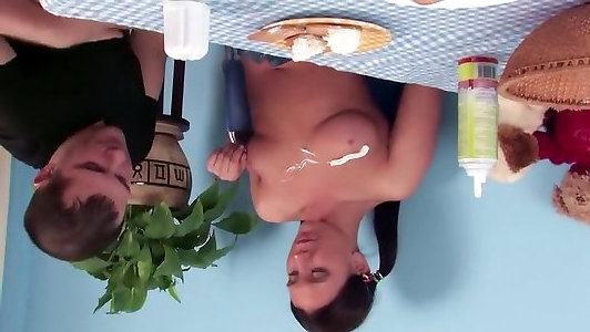 abbronzato babe orgasmi sul tavolo